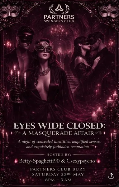 Eyes Wide Closed: A Masquerade Affair at Partners Swingers Club invites you into a night of mystery, elegance, and refined atmosphere, where anonymity and intrigue shape a truly immersive Bank Holiday experience.