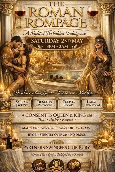 The Roman Rompage at Partners Swingers Club in Bury. A themed Bank Holiday night with a lively crowd, social atmosphere and immersive setting.