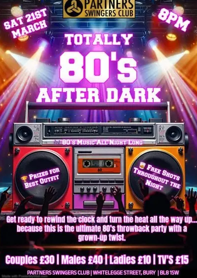 Totally 80’s After Dark at Partners Swingers Club in Bury. A retro-themed night with 80’s music, prizes, and a fun, welcoming atmosphere.